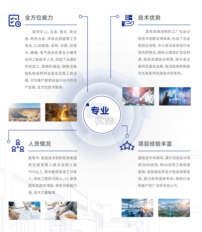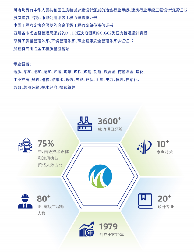 1979年建院以来从单一的冶金和矿山设计拓展到工业与民用建筑、道路、电力、环保、节能、固废等多个行业和领域,发展为多学科、多专业、多行业的甲级设计院。