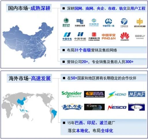 国内实现31个省市自治区,国网、南网、地方电网、用户工程等市场全覆盖。公司在全国设有22家营销机构及技术服务公司,并配备专职技术服务工程师和专属的技术服务车辆,以确保及时、周到的现场服务。