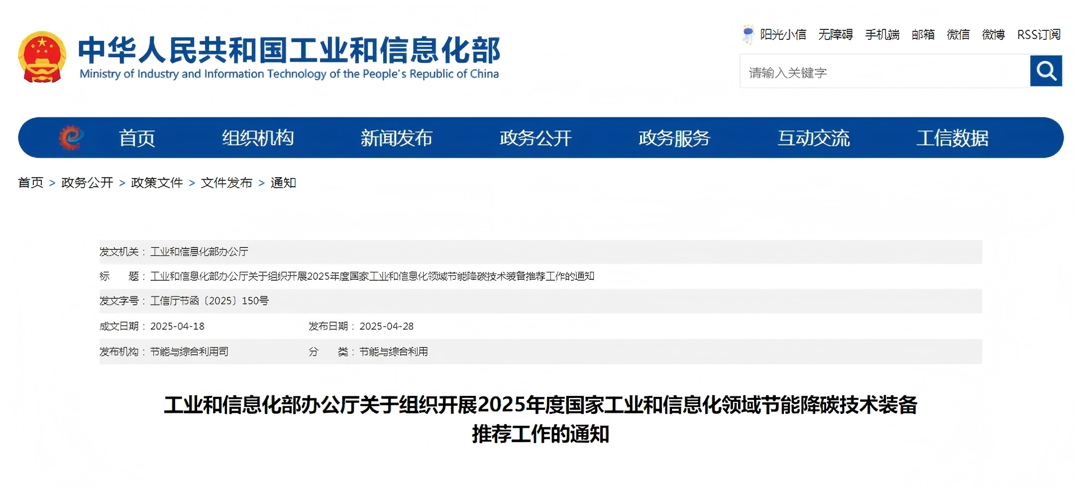 为加快推广节能降碳先进技术,加强重点行业领域技术改造升级和大规模设备更新,现组织开展2025年度工业和信息化领域节能降碳技术装备推荐工作。有关事项通知如下: