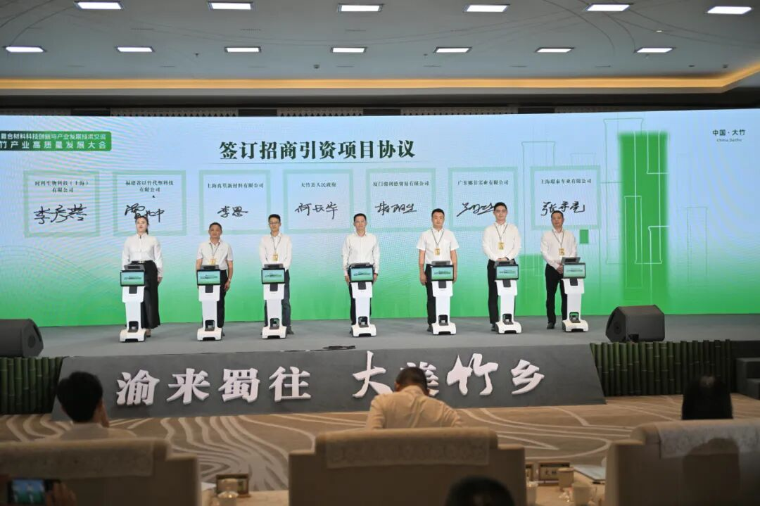 现场发起成立竹缠绕发展专项基金,为竹缠绕复合材料产业规模化发展提供资金保障。鑫竹海(大竹)创新科技有限公司、四川兴竹生物基新材料科技有限公司进行产品推介,拓宽市场合作渠道。合作签约仪式上,四川川东高速公路有限责任公司等企业与鑫竹海(大竹)创新科技有限公司签订了产品订货协议,标志着大竹县竹产业产品获得市场高度认可。这一系列务实举措,不仅为大竹县竹产业高质量发展搭建起高效合作桥梁,更向全国竹产业转型升级注入了极具引领性的“大竹动能”。