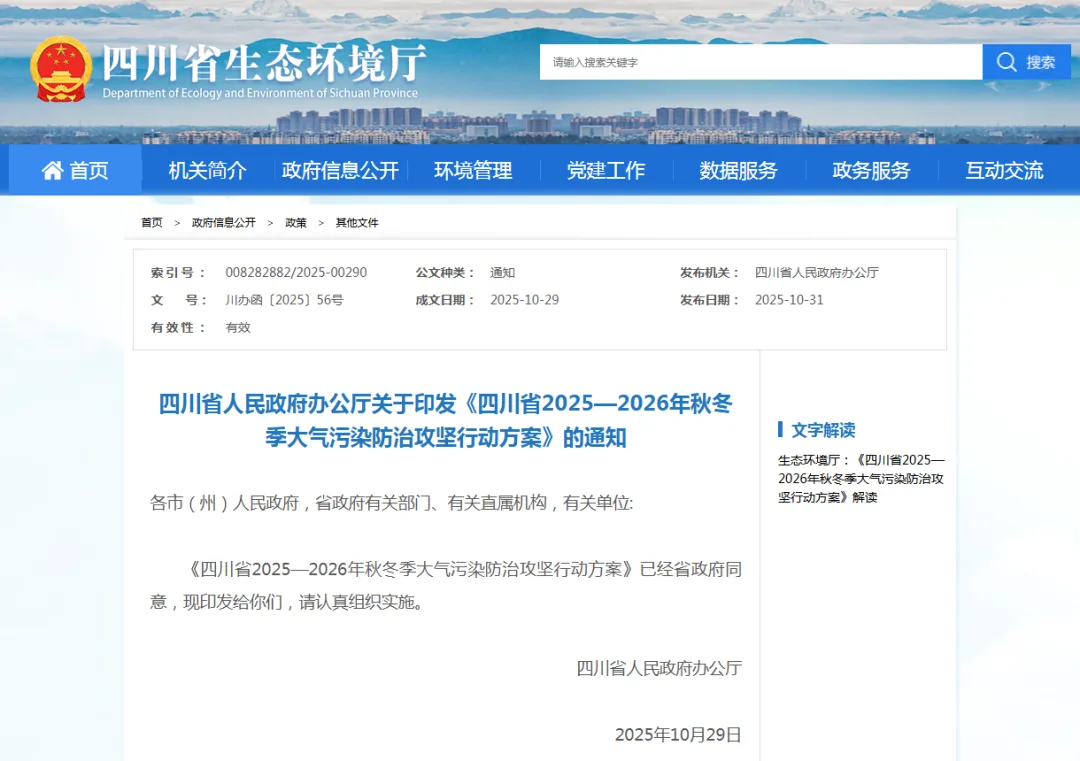 每年的秋冬季是盆地长时间大范围重污染天气高发时段,全省空气质量持续改善面临较大压力。为深入贯彻落实生态环境部和省委、省政府关于深入打好污染防治攻坚战的决策部署,切实降低秋冬季细颗粒物(PM2.5)浓度,基本消除重污染天气,推动全省空气质量持续改善,不断增强人民群众的蓝天幸福感、获得感,10月29日,四川省政府办公厅印发《四川省2025—2026年秋冬季大气污染防治攻坚行动方案》(以下简称《行动方案》)。
