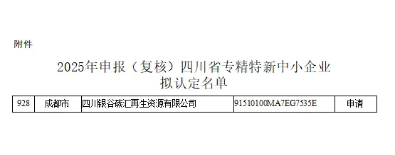近日,四川省经济和信息化厅发布了《关于公布 2025 年度四川省“专精特新”中小企业及通过复核企业名单的通知》,四川银谷碳汇再生资源有限公司凭借在再生资源体系化运营管理系统研发、 智慧监管系统研发、智慧物流等方面专业化、精细化、特色化、新颖化的优秀表现,荣获2025年四川省“专精特新”企业称号。