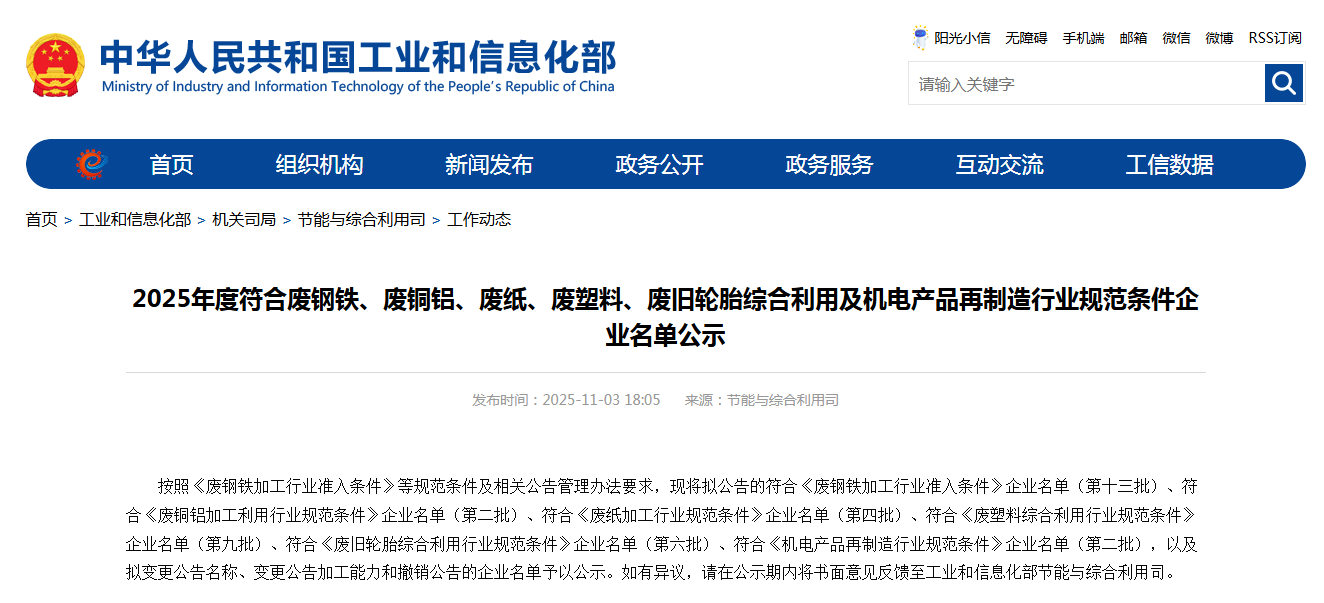 按照《废钢铁加工行业准入条件》等规范条件及相关公告管理办法要求,现将拟公告的符合《废钢铁加工行业准入条件》企业名单(第十三批)、符合《废铜铝加工利用行业规范条件》企业名单(第二批)、符合《废纸加工行业规范条件》企业名单(第四批)、符合《废塑料综合利用行业规范条件》企业名单(第九批)、符合《废旧轮胎综合利用行业规范条件》企业名单(第六批)、符合《机电产品再制造行业规范条件》企业名单(第二批),以及拟变更公告名称、变更公告加工能力和撤销公告的企业名单予以公示。如有异议,请在公示期内将书面意见反馈至工业和信息化部节能与综合利用司。