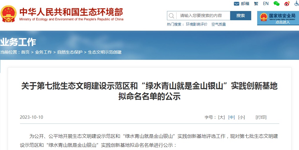 《关于第七批生态文明建设示范区和“绿水青山就是金山银山”实践创新基地拟命名名单的公示》