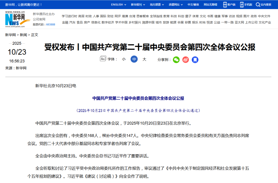 中国共产党第二十届中央委员会第四次全体会议,于2025年10月20日至23日在北京举行。