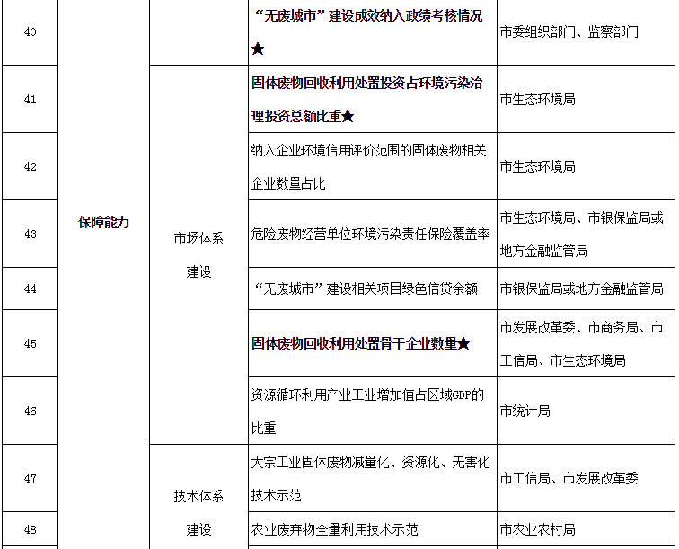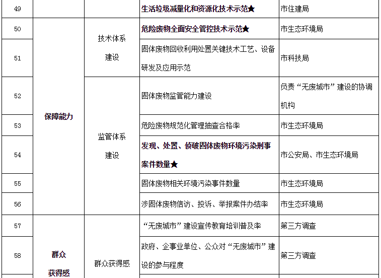 试点城市可参考《“无废城市”建设指标体系(试行)》,科学筛选确定能够充分反映城市固体废物管理重点领域需求、发展阶段、技术经济条件等实际情况的必选指标、可选指标和自选指标,并设定2020年拟达到的目标。