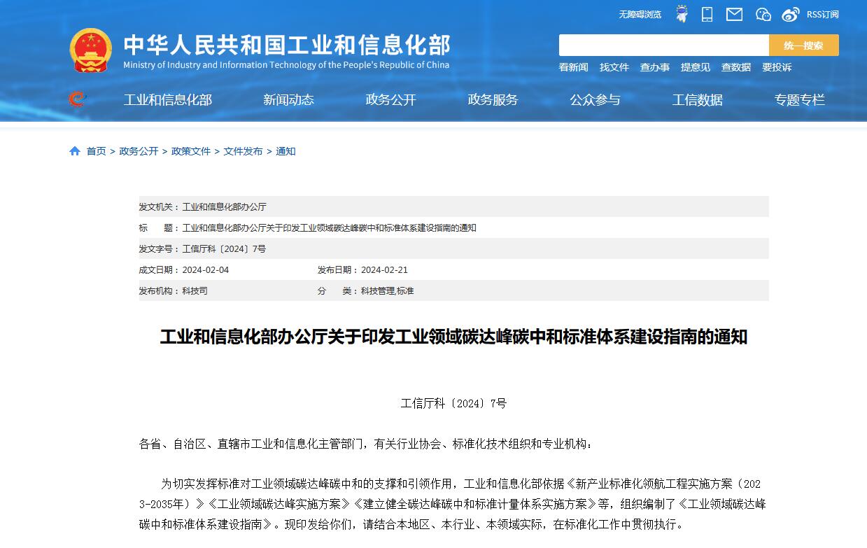 为切实发挥标准对工业领域碳达峰碳中和的支撑和引领作用,工业和信息化部依据《新产业标准化领航工程实施方案(2023-2035年)》《工业领域碳达峰实施方案》《建立健全碳达峰碳中和标准计量体系实施方案》等,组织编制了《工业领域碳达峰碳中和标准体系建设指南》。现印发给你们,请结合本地区、本行业、本领域实际,在标准化工作中贯彻执行。