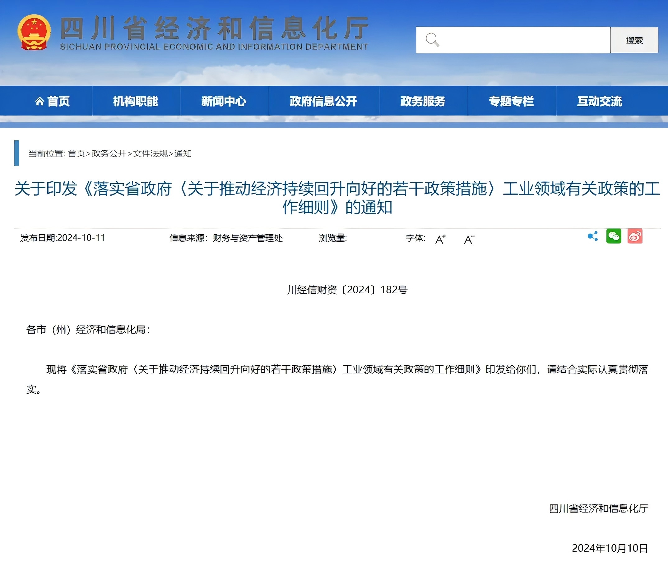 为贯彻落实中央政治局会议和全省经济运行工作推进会议、省政府第35次常务会议和全省工业稳增长视频会议精神,加快落实省政府办公厅《关于推动经济持续回升向好的若干政策措施》(川办规〔2024〕3号)要求,进一步明确工业领域有关政策措施支持范围、支持对象、支持标准、支持方式等内容,管好用好政策资金,特制定本工作细则。