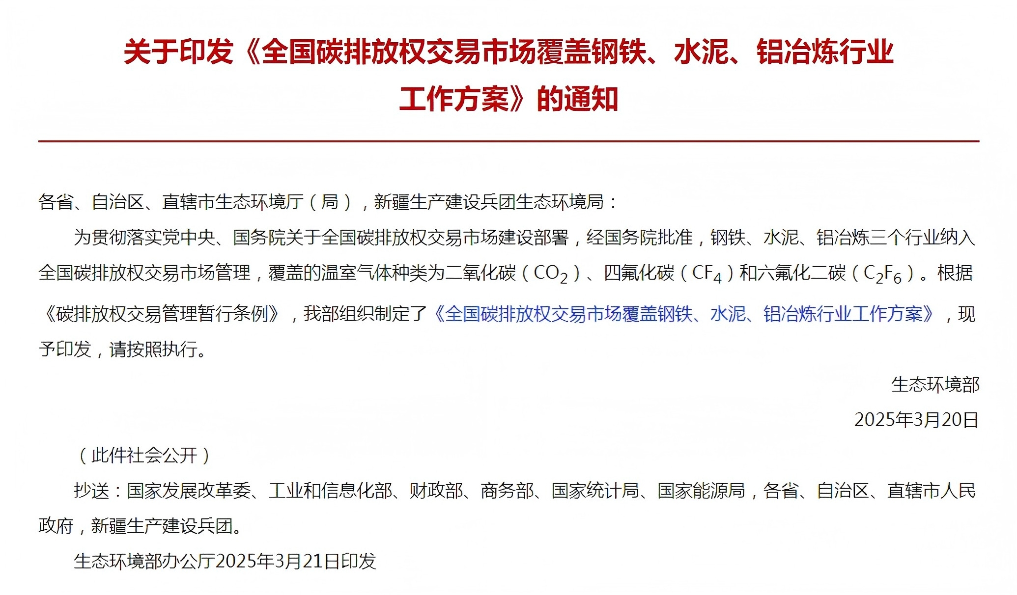 生态环境部关于印发《全国碳排放权交易市场覆盖钢铁、水泥、铝冶炼行业工作方案》的通知